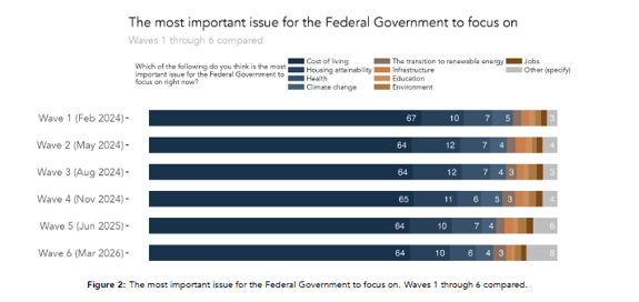 Australia’s national sentiment continues to be dominated by cost-of-living pressures, with groceries remaining the most significant concern despite a modest decline in salience. Notably, petrol prices have emerged as a rapidly growing issue, reflecting heightened sensitivity to everyday expenses. While electricity costs remain a consistent concern, their importance varies across demographics, with increasing concern among Labor voters and those in provincial areas.