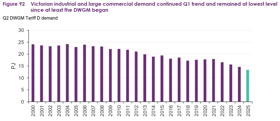 Case Study: Falling gas demand in Victoria In less than five years, Victoria has lost a quarter of its gas-using industrial economy. Once home to a diverse mix of gas-reliant heavy industries, from chemical manufacturing and petroleum refining to food processing and glass production, the state is now seeing that industrial base contract at a pace that is anything but gradual. Victoria’s Tariff D demand, which measures gas use by large industrial and commercial customers, has fallen from 17.9 PJ in 2021 to 13.5 PJ in 2025 — a reduction of 4.4 PJ, or almost 25 per cent. The past year alone saw demand drop from 14.6 PJ in Q2 2024 to 13.5 PJ in Q2 2025, an 8 per cent decline and the lowest Q2 result since the DWGM began in March 1999.[4] As AEMO notes, behind these figures are the closure of major facilities including Qenos, the Mobil Altona refinery, and Oceania Glass, as well as contraction in dairy, food manufacturing, and paper industries. Each of these closures has meant the loss of high-quality industry jobs and the erosion of local supply chains. Once these industries close, they are extraordinarily difficult to bring back — the capital, skills, and market confidence are often lost for good.