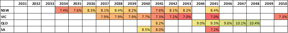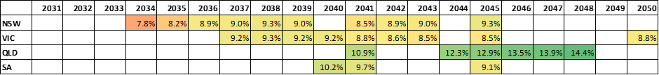 MJA’s IRR modelling shows that most new GPG projects achieve IRRs well below the 9% pre-tax real hurdle rate, even in the Step Change outlook. This remains true across both vertically integrated gentailers and independent power producers.