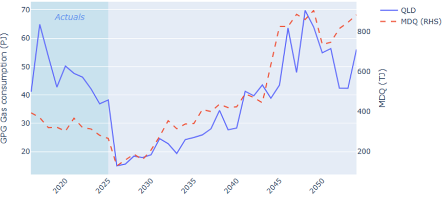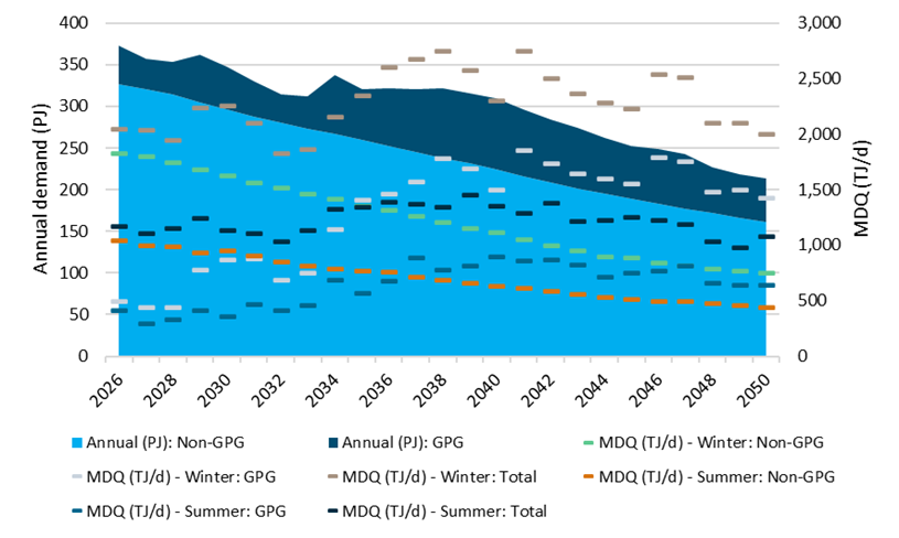 - Maximum daily demand for GPG reaches ~2,750 TJ/day by the late 2030s, stretching pipeline, compression and storage infrastructure.
