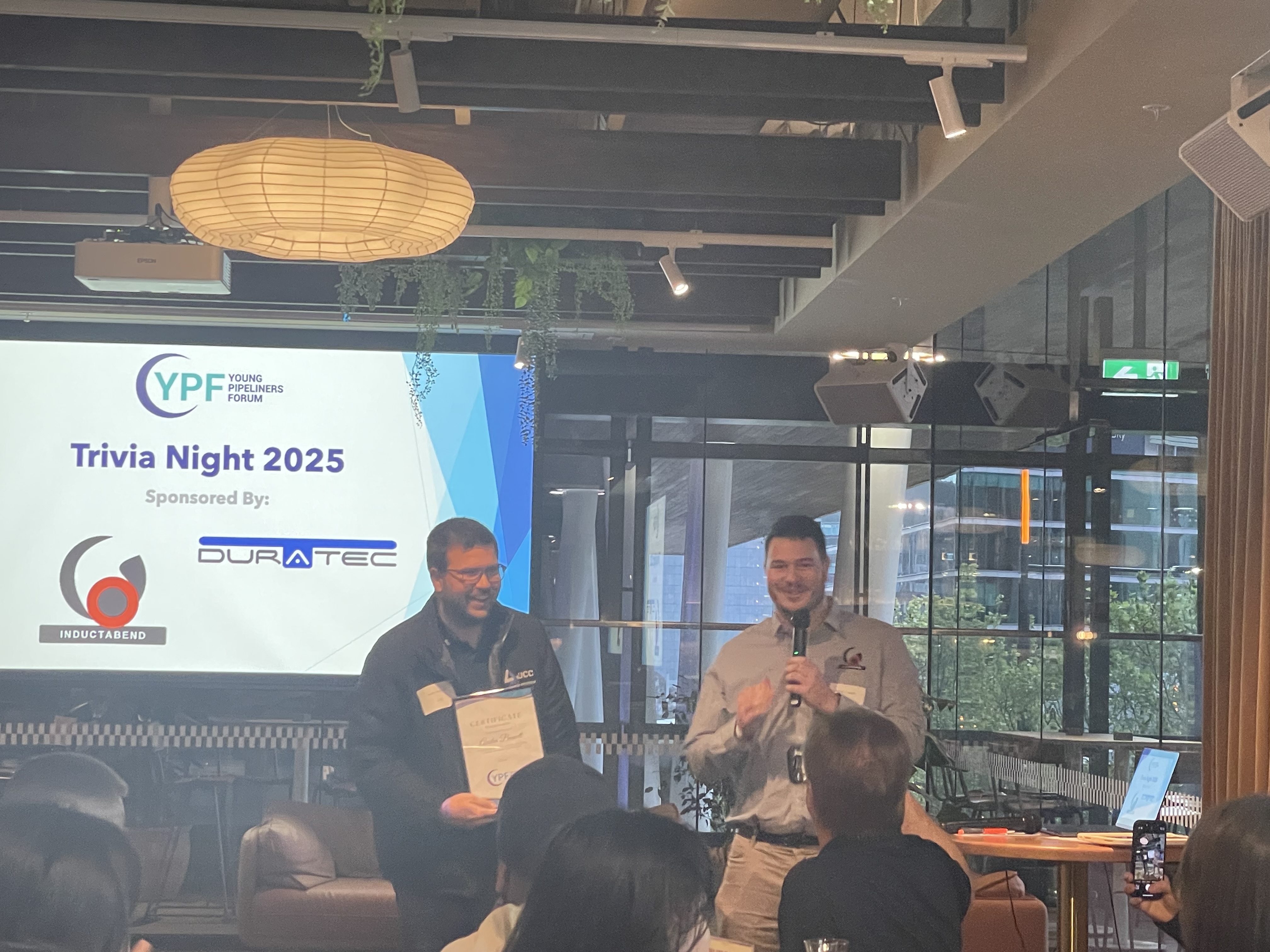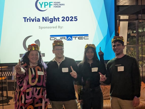 The Young Pipeliners Forum hosted another fantastic Trivia Night on Friday, 3rd October 2025, at Quarterhouse – The Hall, drawing a lively crowd of around 40 attendees. The evening kicked off with an opening address from YPF Chair Nathan Crouch, followed by brief words from our generous sponsors, Duratec and Inductabend, before handing the mic to our charismatic trivia host, Ripley.